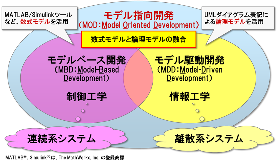 広範囲にわたるソフトウェア開発への要求に応えるため、論理モデルを扱うモデル駆動開発と、数式モデルを扱うモデルベース開発を包含して、論理モデルと数式モデルを総合的に扱うモデル指向開発手法を考案しました。